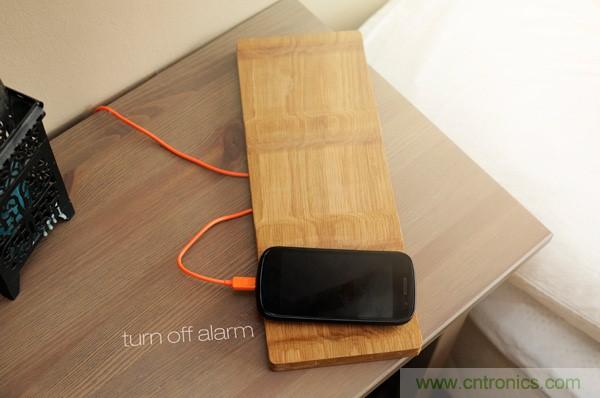 而Tangible Alarm的設(shè)計(jì)Tangible Alarm就像一塊長條形的木板,可以無線同步手機(jī)鬧鐘,通過簡單的移動(dòng)手機(jī),完成各種鬧鐘狀態(tài)的操作。Tangible Alarm共有三個(gè)移動(dòng)的位置,包括小睡移動(dòng)到右側(cè)、關(guān)閉移動(dòng)到左側(cè)以及中間即是當(dāng)前鬧鐘設(shè)置狀態(tài)。
