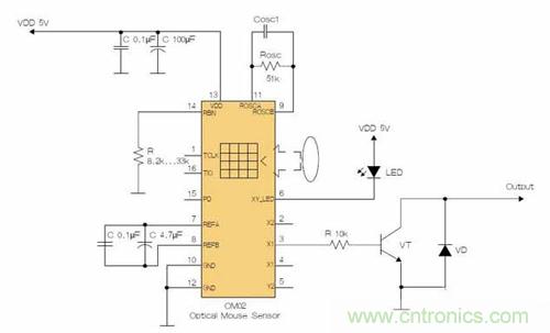 鼠標(biāo)芯片的CMOS光學(xué)傳感器可提供非機(jī)械式跟蹤引擎。在該芯片內(nèi)部可完成圖像的捕獲、數(shù)字化和數(shù)字處理。就拿簡(jiǎn)單且低成本的OM02來(lái)說(shuō),該傳感器通過(guò)采集表面圖像幀來(lái)測(cè)量位置,并通過(guò)數(shù)學(xué)運(yùn)算判定運(yùn)動(dòng)方向和距離。該傳感器安裝聚苯乙烯光學(xué)封裝中,設(shè)計(jì)用來(lái)與高亮度LED一起使用。它有一個(gè)完整且緊湊的跟蹤引擎;沒(méi)有活動(dòng)部件,也不要求精密的光學(xué)對(duì)準(zhǔn)。OM02可以為X和Y方向運(yùn)動(dòng)產(chǎn)生正交輸出信號(hào)。分辨率約為0.0025英寸,運(yùn)動(dòng)速度最高為每秒16英寸。