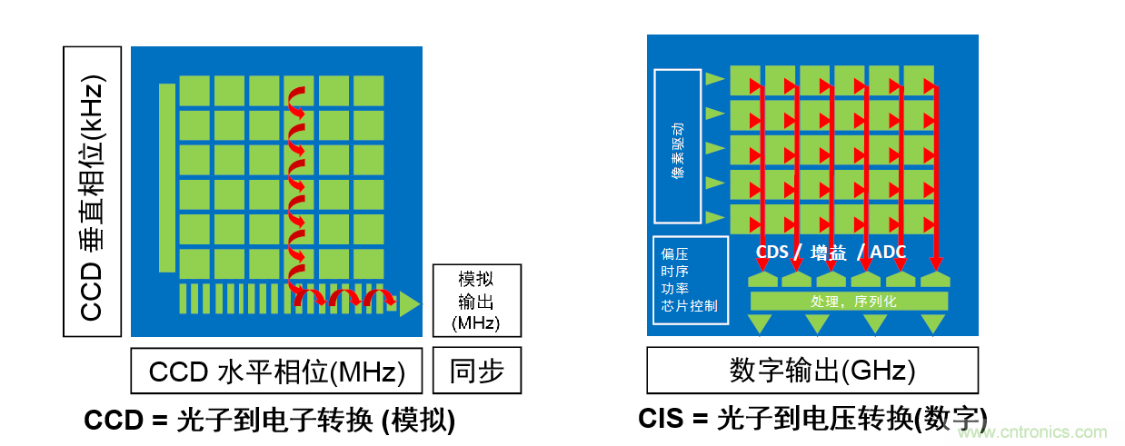 圖1 – CCD 和 CMOS 結(jié)構(gòu)比較表