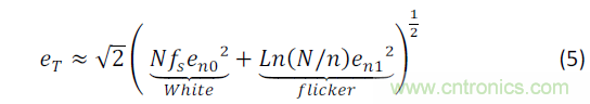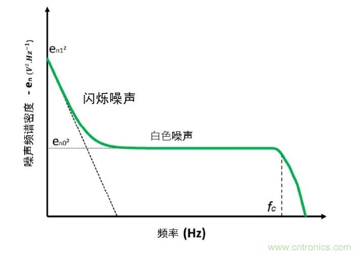 噪聲最由兩個(gè)因素造成:1/f閃爍噪聲和熱噪聲(見圖2)。閃爍噪聲是大自然中常有的噪聲,而它旳頻譜密度和地球自轉(zhuǎn)速度、海底水流、天氣以至氣候現(xiàn)象等活動(dòng)相關(guān)。研究報(bào)告顯示普通蠟燭的閃爍速率是1/f 。在MOS器件和放大鏈各元素中,閃爍噪聲則是技術(shù)工藝誤差生成的缺陷,使電荷被困于柵極氧化物內(nèi)所造成的結(jié)果。電荷進(jìn)出這些“陷阱”,造成晶體管通道內(nèi)的電流不穩(wěn)定 [6],故又稱「隨機(jī)電報(bào)噪聲」(random telegraph noise,RTS)。利用洛倫茲數(shù)學(xué)模型(Lorentzian mathematical model) 可以形容每一個(gè)“陷阱”的共振行為,而模型的總和(即MOSFET通道表面范圍的所有“陷阱”總和)在1/f頻譜上展示時(shí),會(huì)全完符合具體噪聲的頻譜密度。結(jié)果顯示,1/f波幅與MOSFET通道表面面積成反比──而不是完全直觀。