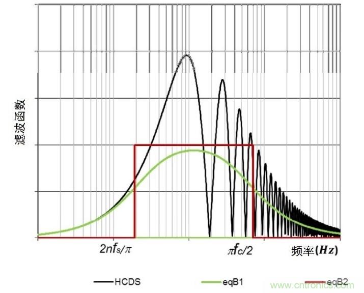 在算式中,fs 是采樣頻率, n是CDS 因子(通常n=2)。如圖3顯示,取決于采樣頻率,這一濾波或多或少地去除1/f噪聲頻率成分,尤其是當(dāng)采樣頻率fs很高的時(shí)候 顯著(換句話說,電荷進(jìn)出“陷阱”的動(dòng)作將慢于CDS頻率)。HCDS濾波器結(jié)合放大鏈的低通濾波器可以簡(jiǎn)化為一個(gè)如圖3所示的等效帶通濾波器。圖中的eqBP1 對(duì)應(yīng)一個(gè)一級(jí)帶通濾波器。這裡eqBP1的噪聲頻譜函數(shù)要除以2,以得到一個(gè)帶有HCDS函數(shù)的等效集成噪聲功率 。eqBP2 是eqBP1的陷波估算值。要取得集成噪聲功率,eqBP2 的上限和下限分別按照下列算式進(jìn)行倍增: