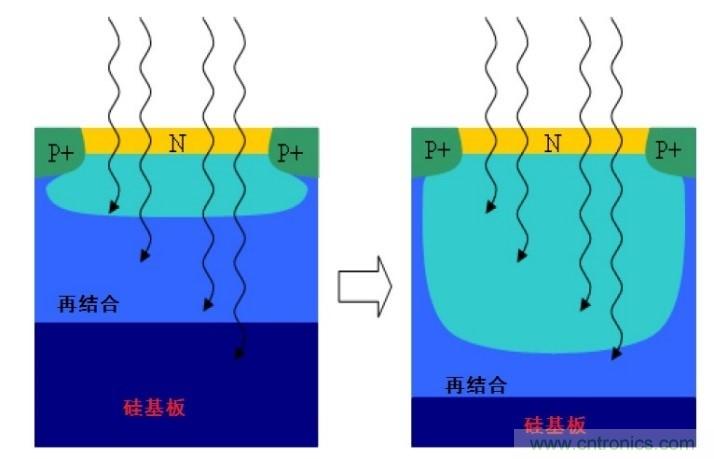 因?yàn)檫@個(gè)原因,ITCCD不能從BSI中獲益。而高端CCD因?yàn)槭褂么怪笨箷灩に?,所以沒有這一限制。而CMOS也具有同一特點(diǎn):在薄的感測(cè)層上,因?yàn)殡姾刹粫?huì)在像素之間滲透,所以沒有串?dāng)_的缺點(diǎn)。結(jié)果是ITCCD和標(biāo)準(zhǔn)CIS都能夠?qū)崿F(xiàn)良好的空域解析度或調(diào)制轉(zhuǎn)換函數(shù)(modulated transfer function,MTF) 。要增加NIR部份和敏感度,需要顯著增加物料厚度,但是厚物料會(huì)增加光電串?dāng)_,引致MTF衰減。成像質(zhì)量是MTF和QE的綜合結(jié)果(即所謂的檢測(cè)量子效率Detective Quantum Efficiency,DQE),所以必需同時(shí)考量空域和時(shí)域因素。圖6顯示利用硅摻雜方法恢復(fù)MTF的深耗盡(deep depletion)光電二極管。一般來說,CIS使用類似集成電路的常用技術(shù)(特別是DRAM/內(nèi)存工藝)生產(chǎn),所以不會(huì)牽涉上述的特定工藝配方。不過近期的技術(shù)研究文章展示適用于CIS的特定工藝導(dǎo)入方案,能實(shí)現(xiàn)出色的QE改進(jìn)甚至相對(duì)接近高端CCD的水平(見圖5)。最新的CMOS技術(shù)趨勢(shì)可說是突飛猛進(jìn),引進(jìn)了如導(dǎo)光板、深槽隔離(deep trench isolation,DTI)、埋藏微透鏡,以及在光敏范圍下嵌入包含像素晶體管的迭層芯片等技術(shù)。