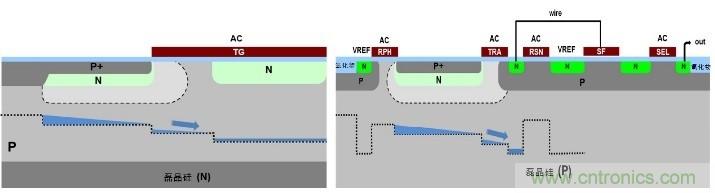 “嵌入式光電二極管” (pinned photodiode,PPD) 或“空穴堆積二極管”(hole accumulation diode,HAD) 最初開發(fā)目的是消除延遲并把全部電荷從光電二極管轉(zhuǎn)移到ITCCD寄存器[12]。CMOS圖像傳感器的一個(gè)重大發(fā)展是在2000年代初期引進(jìn)ITCCD光電二極管結(jié)構(gòu)[11],如圖7所示。在CMOS中,像素結(jié)構(gòu)多數(shù)以每像素的晶體管數(shù)目來表示。大部分 CMOS圖像傳感器傾向使用電子卷簾快門(electronic rolling shutter),這有助于集成并只需少至三個(gè)晶體管 (3T)就能實(shí)現(xiàn)。雖然有結(jié)構(gòu)簡(jiǎn)單的優(yōu)點(diǎn),3T像素結(jié)構(gòu)的缺點(diǎn)是電路來自kT/C (或溫度) 噪聲的像素生成時(shí)域噪聲會(huì)較大,而且不能輕易消除。