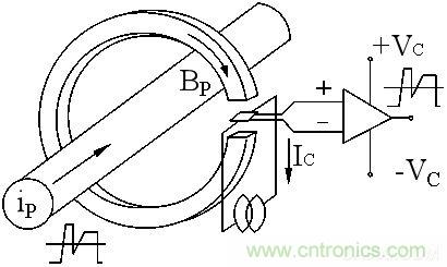 開(kāi)環(huán)霍爾電流傳感器基于直測(cè)式霍爾原理,即開(kāi)環(huán)原理(也稱只測(cè)試霍爾),原邊電流IP產(chǎn)生的磁通被高品質(zhì)磁芯聚集在磁路中,霍爾元件固定在很小的氣隙中,對(duì)磁通進(jìn)行線性檢測(cè),霍爾器件輸出的霍爾電壓經(jīng)過(guò)特殊電路處理后,副邊輸出與原邊波形一致的跟隨輸出電壓,此電壓能夠精確反映原邊電流的變化。原理圖及外形如下: