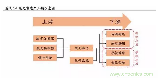 高頻激光可在一秒內(nèi)獲取大量(106-107數(shù)量級(jí))的位置點(diǎn)信息(稱為點(diǎn)云),并根據(jù)這些信息進(jìn)行三維建模。除了獲得位置信息外,它還可通過激光信號(hào)的反射率初步區(qū)分不同材質(zhì)。激光雷達(dá)是產(chǎn)業(yè)鏈的核心,下游應(yīng)用于測繪和導(dǎo)航