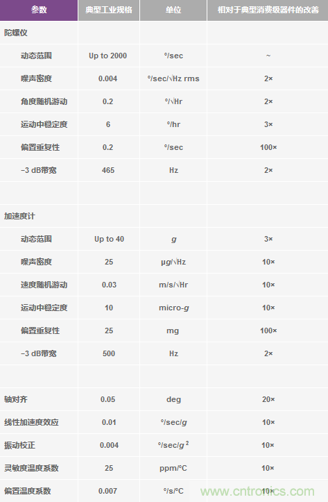 表6.工業(yè)MEMS器件對(duì)所有已知潛在誤差源進(jìn)行全面測(cè)定,通常能實(shí)現(xiàn)消費(fèi)類(lèi)器件高出一個(gè)數(shù)量級(jí)或更高的精度水平