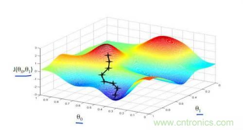 以上我們是以一維數(shù)據(jù)來(lái)看梯度下降,但我們的照片是多維數(shù)據(jù),此時(shí)如何求導(dǎo)數(shù)?又如何梯度下降呢?此時(shí)我們需要用到偏導(dǎo)數(shù)的概念。其實(shí)它與導(dǎo)數(shù)很相似,因?yàn)閤是多維向量,那么我們假定計(jì)算Xi的導(dǎo)數(shù)時(shí),x上的其他數(shù)值不變,這就是Xi的偏導(dǎo)數(shù)。此時(shí)應(yīng)用梯度下降法就如下圖所示,θ是二維的,我們分別求θ0和θ1的導(dǎo)數(shù),就可以同時(shí)從θ0和θ1兩個(gè)方向移動(dòng)相應(yīng)的步長(zhǎng),尋找最低點(diǎn),如下圖所示: