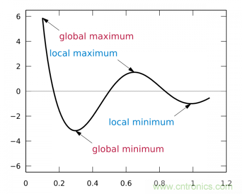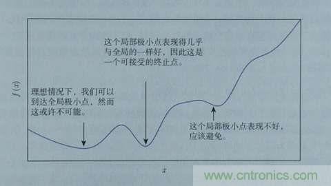 這樣,斜率為0時(shí)我們其實(shí)就得到了函數(shù)f在該點(diǎn)可以得到最小值。那么,把x向左或者向右移一點(diǎn),到底移多少呢?如果移多了,可能移過(guò)了,如果移得很少,則可能要移很久才能找到最小點(diǎn)。還有一個(gè)問(wèn)題,如果f(x)操作函數(shù)有多個(gè)局部最小點(diǎn)、全局最小點(diǎn)時(shí),如果x移的非常小,則可能導(dǎo)致通過(guò)導(dǎo)數(shù)只能找到某個(gè)并不足夠小的局部最小點(diǎn)。如下圖所示: