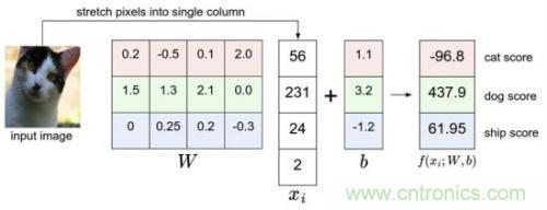 比如我們有訓(xùn)練數(shù)據(jù)集照片對(duì)應(yīng)著cat、dog、ship三個(gè)類別,某個(gè)輸入照片經(jīng)過(guò)函數(shù)f(x)=x*W+b,前向運(yùn)算得到該照片屬于這3個(gè)分類的得分值。此時(shí),這個(gè)函數(shù)被稱為得分函數(shù),如下圖所示,假設(shè)左邊關(guān)于貓的input image是一個(gè)4維向量[56,231,24,2],而W權(quán)重是一個(gè)4*3的矩陣,那么相乘后再加上向量[1.1,3.2,-1.2]可得到在cat、 dog、ship三個(gè)類別上的得分: