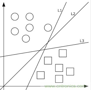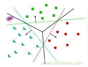 給定隨機(jī)數(shù)作為a,c,b的初始值,我們通過(guò)訓(xùn)練數(shù)據(jù)不斷的優(yōu)化參數(shù)a,b,c,把不合適的L1、L3等分類函數(shù)逐漸訓(xùn)練成L2,這樣的L2去面對(duì)泛化的測(cè)試數(shù)據(jù)就可能獲得更好的效果。然而如果有多個(gè)類別,就需要多條分類直線才能分出,如下圖所示: