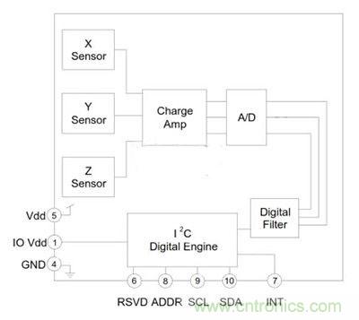 圖2:Kionix公司KXCJ9硅加速度計(jì)容納于在從第二貼合晶片在晶片級別創(chuàng)建一個密閉的腔。一個單獨(dú)的信號處理ASIC上安裝有傳感元件,以進(jìn)一步降低傳感器的整體尺寸,產(chǎn)生了3&TImes;3&TImes;0.9毫米的LGA塑料封裝從1.8操作 - 3.6伏直流電源。穩(wěn)壓器用于保持對輸入電源電壓范圍內(nèi)恒定的內(nèi)部工作電壓。這樣,可以通過輸入電源電壓的范圍內(nèi)穩(wěn)定的工作特性,以從供給變異去除任何錯誤,并消除了對外部電源調(diào)節(jié),進(jìn)一步降低了設(shè)計(jì)的整體尺寸。
