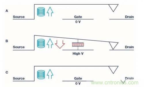 請注意,即便是在開啟位置上,開關(guān)梁仍然會有將開關(guān)往上拉動的彈簧力(藍色箭頭),但是只要向下拉動的靜電力量比較大,那么開關(guān)就會維持在開啟的狀態(tài)。 最后,當閘極電壓被移除時(圖一中的C狀況),也就是在閘極電極上0 V,靜電吸引力也會跟著消失,而開關(guān)梁會以具有足夠回復力(藍色箭頭)的彈簧而動作,開啟源極與汲極之間的鏈接,然后回返至原本的關(guān)閉位置。