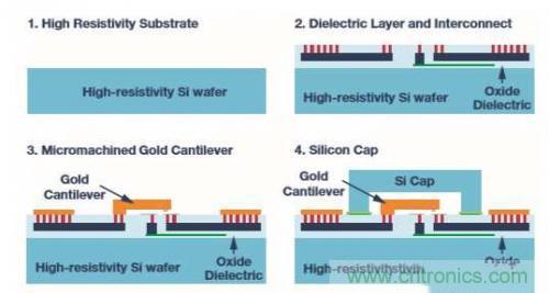 圖二中所示為利用MEMS技術(shù)制造開關(guān)的四個主要步驟。 該開關(guān)是以高電阻率的硅芯片(具有沈積在頂部的厚電介質(zhì)層以提供與下方基板的優(yōu)越電氣隔離)所建構(gòu)。 使用了標準的后端CMOS內(nèi)部鏈接制程實現(xiàn)與MEMS開關(guān)的內(nèi)部鏈接。 低電阻率金屬與多晶硅都被用來制作與MEMS開關(guān)的電氣鏈接,而且都被嵌入至電介質(zhì)層當中。