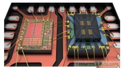 圖四 : 驅(qū)動IC(左側(cè)),MEMS開關(guān)芯片(右側(cè))被黏著和線焊至金屬導線架上