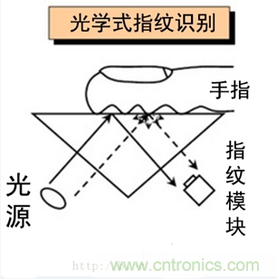 光學(xué)傳感器的發(fā)展歷史可能是最久的了,已經(jīng)有30年的歷史了。實(shí)現(xiàn)的原理也是最簡(jiǎn)單的。 它主要是利用光的折攝和反射原理,將手指放在光學(xué)鏡片上,手指在內(nèi)置光源照射下,光從底部射向三棱鏡,并經(jīng)棱鏡射出,射出的光線在手指表面指紋凹凸不平的線紋上折射的角度及反射回去的光線明暗就會(huì)不一樣。用棱鏡將其投射在電荷耦合器件上CMOS或者CCD上,進(jìn)而形成脊線(指紋圖像中具有一定寬度和走向的紋線)呈黑色、谷線(紋線之間的凹陷部分)呈白色的數(shù)字化的、可被指紋設(shè)備算法處理的多灰度指紋圖像。