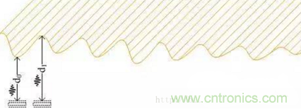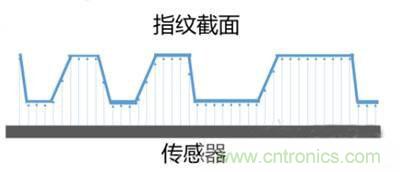 其原理是將電容感整合于一塊芯片中,當(dāng)指紋按壓芯片表面時(shí),內(nèi)部電容感測(cè)器會(huì)根據(jù)指紋波峰與波谷而產(chǎn)生的電荷差,從而形成指紋影像。如下簡(jiǎn)圖,可以把上面的凹凸認(rèn)為是指紋的谷和脊,那么同傳感器就會(huì)形成不同的電容差,這樣傳感器就可以根據(jù)這些不同的電容差畫出指紋的紋理。