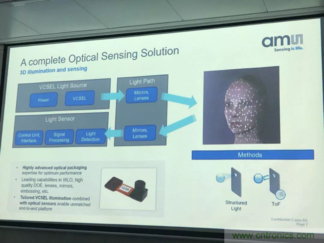 收購案例#2:艾邁斯半導(dǎo)體曾收購一家在做面部識(shí)別軟件方面特別強(qiáng)的企業(yè)KeyLemon,這家公司已有7年的歷史了,具備領(lǐng)先的3D人臉識(shí)別知識(shí)產(chǎn)權(quán)庫。同時(shí),他們的軟件現(xiàn)在已經(jīng)能在安卓系統(tǒng)中運(yùn)行了。因此,艾邁斯半導(dǎo)體可以在消費(fèi)類應(yīng)用中提供可用于3D感應(yīng)的軟件+硬件解決方案。“我們本身的傳感優(yōu)勢,加上收購企業(yè)的技術(shù),我們便可提供世界一流的完整解決方案。除了VCSEL之外,還有TOF(飛行時(shí)間)和結(jié)構(gòu)光等,可以通過我們的傳感技術(shù)整合成一個(gè)完整的解決方案。” Everke指出。