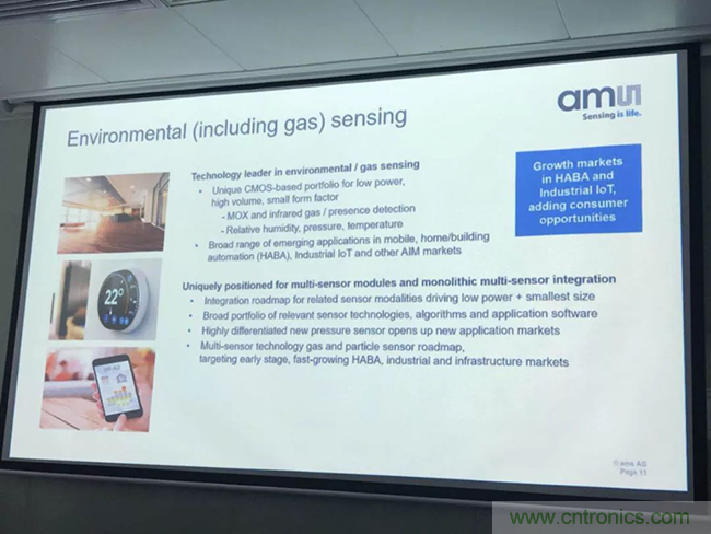 在環(huán)境方面,艾邁斯半導(dǎo)體有溫度、壓力、氣體、濕度傳感器,會(huì)應(yīng)用于IoT市場或者是移動(dòng)市場。艾邁斯半導(dǎo)體可以把所有的這些傳感功能集成到單芯片上,因此,它可以做得非常小,但是功能又非常齊全。艾邁斯半導(dǎo)體的壓力傳感器非常有趣,它的靈敏度可以根據(jù)氣壓來測量,這個(gè)可以用于室內(nèi)GPS。