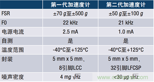 表2. 第一代和第二代MEMS加速度計針對狀態(tài)監(jiān)控的關(guān)鍵規(guī)格比較