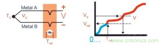 熱電偶是溫度測(cè)量中最常用的傳感器。其主要好處是寬溫度范圍和適應(yīng)各種大氣環(huán)境,而且結(jié)實(shí)、價(jià)低,無需供電,尤其最便宜。熱電偶由在一端連接的兩條不同金屬線(金屬A和金屬B)構(gòu)成,如圖1所示。當(dāng)熱電偶一端受熱時(shí),熱電偶電路中就有電勢(shì)差??捎脺y(cè)量的電勢(shì)差來計(jì)算溫度。