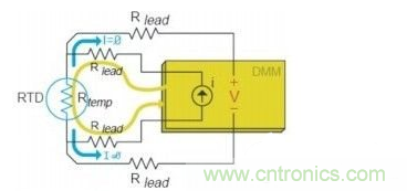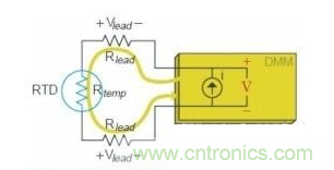與熱敏電阻相似,鉑電阻溫度傳感器(RTD)也是用鉑制成的熱敏感電阻。當(dāng)通過測(cè)量電壓計(jì)算RTD 溫度時(shí),數(shù)字萬用表用已知電流源測(cè)量該電流源所產(chǎn)生的電壓。這一電壓為兩條引線(Vlead)上的壓降加RTD上的電壓(Vtemp)。例如,常用RTD 的電阻為100Ω,每1℃僅產(chǎn)生0.385Ω的電阻變化。如果每條引線有10Ω電阻,就將造成26℃的測(cè)量誤差,這是不可接受的。所以應(yīng)對(duì)RTD作4線歐姆測(cè)量。