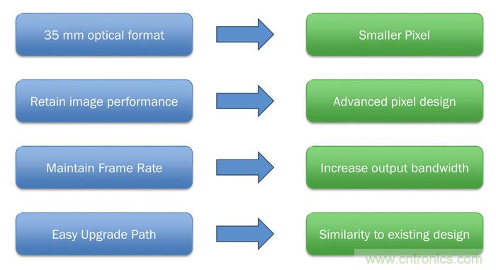 為了在保留35 mm光學格式的同時,將器件(例如KAI-29050)的分辨率從現(xiàn)有的2900萬像素繼續(xù)提升,就需要更小的像素格式,以便將更多像素放置于給定區(qū)域中。但為同時保留這一較小像素中的關(guān)鍵成像參數(shù),如圖像均勻性、動態(tài)范圍和底噪,除了簡單地縮小尺寸外,還需要提升像素設計。