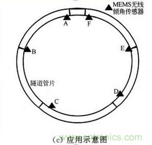 無線傾角傳感器采用電池供電,將MEMS無線傾角傳感器安裝在盾構(gòu)隧道內(nèi)襯砌圓環(huán)的管片上,包括封頂塊、鄰接塊、標準塊、封底塊和塊與塊間以環(huán)向螺連接構(gòu)成的縱向接頭等不同部位;實時測量隧道管片內(nèi)各部位的傾斜角度,通過組合計算得出管片的實際形變,實現(xiàn)對隧道結(jié)構(gòu)變化準確、有效地實時監(jiān)測,應用示意如圖(c)所示。
