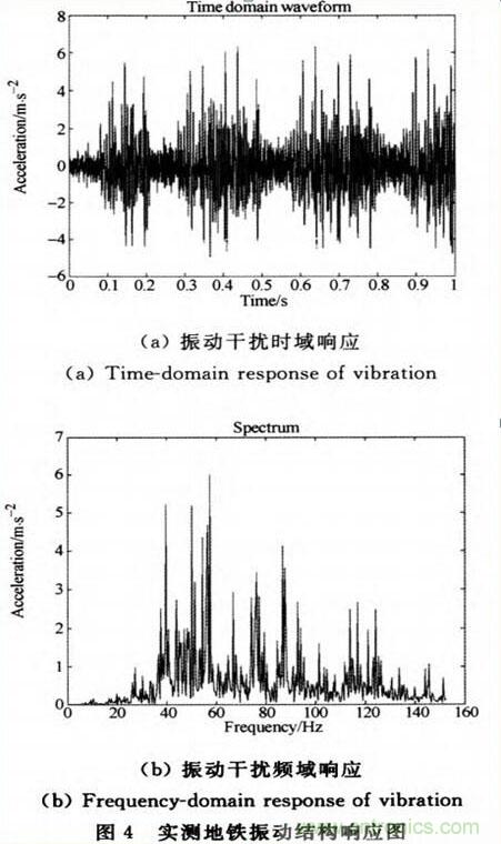 在上海地鐵11號線昌吉東路站對振動信號進行檢測,利用加速度傳感器對振動信號進行采樣,采樣頻率為5 kHz,采樣點數(shù)為32678,得到實測地鐵振動信號時域曲線如圖4(a)所示,通過Matlab利用FFT變換得到其頻域曲線,如圖4(b)所示。