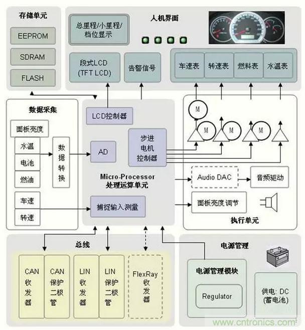 在汽車(chē)儀表系統(tǒng)中,各種儀表的傳感器的作用是將發(fā)動(dòng)機(jī)溫度、機(jī)油壓力、發(fā)動(dòng)機(jī)轉(zhuǎn)速、變速器輸出軸轉(zhuǎn)速、燃油箱油面的高低等物理參量轉(zhuǎn)換為相應(yīng)的電壓、電流或電脈沖。并驅(qū)動(dòng)相應(yīng)的儀表動(dòng)作,顯示相應(yīng)的被測(cè)量參量。當(dāng)測(cè)量值達(dá)到預(yù)設(shè)的極限值時(shí)就會(huì)使指示燈報(bào)警。