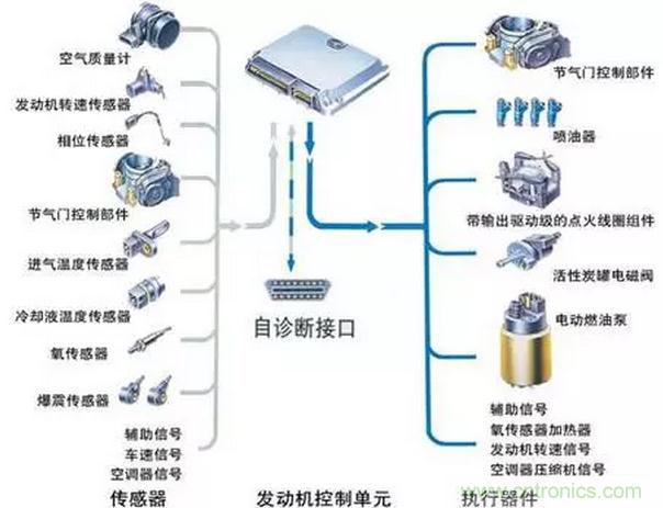 汽車(chē)電子控制系統(tǒng)有傳感器、電子控制器(ECU)和執(zhí)行器的組成。在汽車(chē)電子控制系統(tǒng)中,傳感器的作用是將被控對(duì)象的相關(guān)參量轉(zhuǎn)換為相應(yīng)的電信號(hào),并輸送給控制器,控制器根據(jù)相關(guān)傳感器的信號(hào)對(duì)被控對(duì)象的工況及狀態(tài)進(jìn)行分析與判斷后,輸出控制信號(hào),通過(guò)執(zhí)行器實(shí)現(xiàn)自動(dòng)控制。電子控制系統(tǒng)分為發(fā)動(dòng)機(jī)電子控制系統(tǒng)、底盤(pán)電子控制系統(tǒng)和車(chē)身電子控制系統(tǒng)。