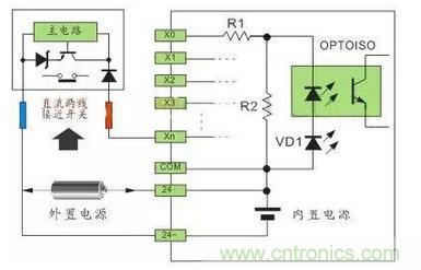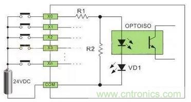 PLC 的數(shù)字量輸入接口并不復(fù)雜,PLC 為了提高抗干擾能力,輸入接口都采用光電耦合器來隔離輸入信號與內(nèi)部處理電路的傳輸。因此,輸入端的信號只是驅(qū)動(dòng)光電耦合器的內(nèi)部 LED 導(dǎo)通,被光電耦合器的光電管接收,即可使外部輸入信號可靠傳輸。