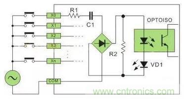 直流電可以由PLC內(nèi)部提供也可以外接直流電源提供給外部輸入信號的元件。R2在電路中的作用是旁路光電耦合器內(nèi)部LED的電流,保證光電耦合器LED不被兩線制接近開關(guān)的靜態(tài)泄漏電流導(dǎo)通。