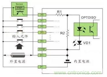 SINK輸入方式,可接 NPN 型傳感器,即 X 端口與負(fù)極相連。