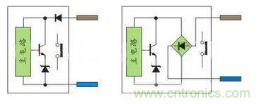 直流兩線制接近開關(guān)分二極管極性保護(hù)與橋整流極性保護(hù),前者在接PLC時(shí)需要注意極性,后者就不需要注意極性。有源舌簧磁性開關(guān)主要用在汽缸上做位置檢測,由于需要信號指示,內(nèi)部有雙向二極管回路,因此也不需要注意極性;交流兩線制接近開關(guān)就不需要注意極性。如圖10: