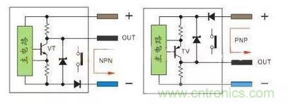 PNP型當(dāng)傳感器有檢測信號VT導(dǎo)通,正極的電流流向輸出端OUT,輸出端OUT電位接近正極,通常說的低電平翻轉(zhuǎn)成高電平。