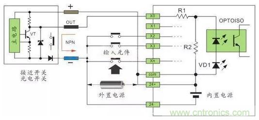 無源干接點(diǎn)比較簡單,接線容易。不存在電源的極性,壓降等因素,上圖3-6中的輸入元件這是此類型。這里不重復(fù)介紹。
