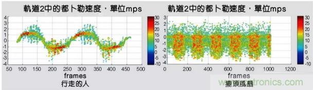 圖3:兩張圖顯示了行走的人和擺頭風(fēng)扇隨時(shí)間推移的微多普勒信息