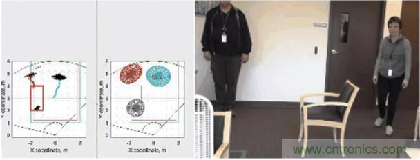 圖4:使用毫米波傳感器執(zhí)行分類的范例:中間圖上所有移動目標(biāo)都分配了一個(gè)軌道,其中的每個(gè)彩色區(qū)域代表一個(gè)人