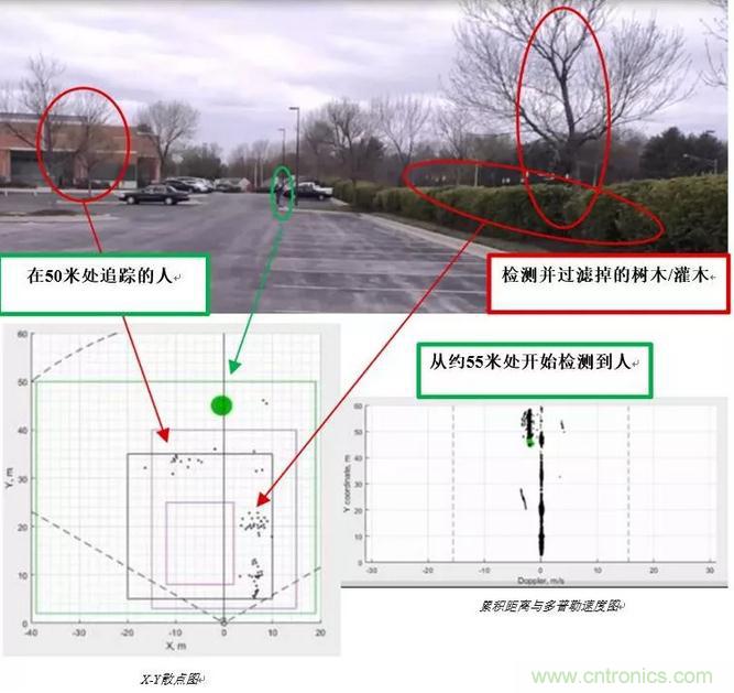 圖2顯示了使用毫米波技術(shù)的入侵檢測(cè);毫米波傳感器分析場(chǎng)景中對(duì)象的速度,過(guò)濾掉移動(dòng)背景中的運(yùn)動(dòng),僅跟蹤人物。