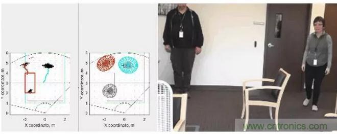 圖4:使用毫米波傳感器執(zhí)行分類(lèi)的示例:中間圖上所有移動(dòng)目標(biāo)都分配了一個(gè)軌道,彩色區(qū)域表示人