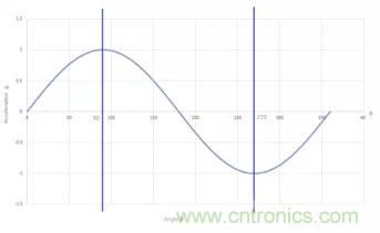 如下圖,當(dāng)角度在90°到270°,單軸加速度傳感器輸出值A(chǔ)x與角度一一對(duì)應(yīng),超過(guò)這個(gè)范圍,每個(gè)輸出值A(chǔ)x在360°范圍內(nèi),對(duì)應(yīng)兩個(gè)傾斜角度,無(wú)法有效的區(qū)分。