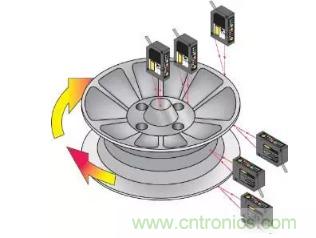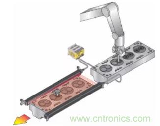 在流程的下一步驟之前驗(yàn)證關(guān)鍵部件是否到位并處于正確位置是一項(xiàng)常見(jiàn)要求。光電傳感器可以輕松實(shí)現(xiàn)這一目標(biāo),最新型號(hào)甚至可以檢測(cè)零件的最小和最窄邊緣。在圖示中,兩個(gè)傳感器可以形成僅為百分之一英寸的會(huì)聚點(diǎn),以精確地檢測(cè)半導(dǎo)體晶片的邊緣。在該示例中,傳感器不僅驗(yàn)證晶片的存在,而且還可以檢測(cè)晶片是否在盒中傾斜。