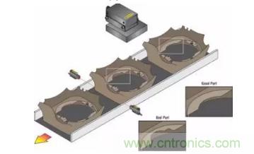 隨著過(guò)去幾年傳感技術(shù)的進(jìn)步,用戶現(xiàn)在能夠?qū)⒕哂谐杀拘б娴臏y(cè)量功能集成到他們的工藝中,分辨率高達(dá)0.0001英寸。在下一個(gè)制造步驟之前,可以自動(dòng)檢查零件的關(guān)鍵屬性。在圖示中,激光傳感器檢查在夾具中旋轉(zhuǎn)的鑄造輪,以確保在加工之前沒(méi)有空隙或過(guò)多的跳動(dòng)。