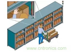 順序手動(dòng)裝配中人的準(zhǔn)確性也是防錯(cuò)的一個(gè)大問(wèn)題。PLC控制的“揀選”系統(tǒng)使用指示下一個(gè)要選擇的項(xiàng)目的燈,以及每個(gè)箱前面的光幕來(lái)驗(yàn)證是否已經(jīng)采取了正確的部件。這些系統(tǒng)通過(guò)減少錯(cuò)過(guò)的零件以及以錯(cuò)誤順序組裝的零件來(lái)提高裝配操作的質(zhì)量百分比。除了裝配過(guò)程的防錯(cuò)之外,它們還通過(guò)在裝配過(guò)程中始終驗(yàn)證裝配工最后停止的位置來(lái)提高工人效率,即使在休息或停工之后也是如此。這種完全可視化的通信系統(tǒng)也是一種全球解決方案,可消除語(yǔ)言障礙和技術(shù)能力等培訓(xùn)障礙。該圖顯示了倉(cāng)庫(kù)應(yīng)用程序。