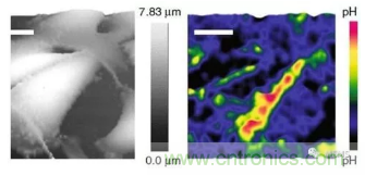 傳感器,該傳感器對0.01單位以下的pH值變化非常敏感,響應(yīng)時間為2 ms,空間分辨率為50 nm。