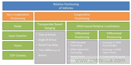 用于車輛相對定位的測距傳感器和技術可以概括為下圖,首先分為兩大類:非協(xié)作式定位和協(xié)作式定位。非協(xié)作式定位包括:雷達、激光掃描儀、視覺和TOF攝像機;協(xié)作式定位包括:基于轉發(fā)器的測距(根據(jù)射頻信號直接估算相對距離)和基于GNSS的相對定位(通過通訊的方式傳遞GNSS測得的位置相關信息,包括GNSS解算得到的位置和原始的GNSS信息,如偽距)。具體對各個定位技術的介紹請參見原文,限于篇幅,本譯文只進行部分翻譯,著重于定位需求的分析以及對各個定位技術的評價。