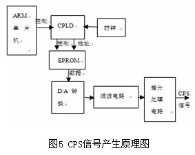 曲軸位置信號(CPS)是PCM控制點火系統(tǒng)中最主要的傳感器信號,為適應(yīng)多種PCM的需求,設(shè)計采用CPLD和DA的方式產(chǎn)生。CPS信號產(chǎn)生原理如圖5所示,在EPROM中存有一個周期的正弦表數(shù)據(jù),當(dāng)需要產(chǎn)生 CPS信號時,ARM單片機對CPLD進行設(shè)置,CPLD根據(jù)接收的控制命令,通過時鐘計數(shù),產(chǎn)生讀存儲器的信號,并向EPROM提供合適的地址信號和控制信號,EPROM輸出相應(yīng)地址的數(shù)據(jù),經(jīng)D/A轉(zhuǎn)換,變成單端CPS模擬信號,然后經(jīng)濾波電路和單端轉(zhuǎn)差分處理電路,輸出CPS差分信號。在實際的電路實現(xiàn)中,對CPS信號的控制可由計算機通過CAN總線向ARM發(fā)出控制命令進行設(shè)置,因此,即使ARM芯片在運行過程中復(fù)位,電路仍能輸出正確的CPS信號,以確保測試周期的正常進行。