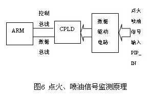 點火和噴油信號是汽車發(fā)動機中的關(guān)鍵信號,其周期和時序直接關(guān)系到汽車的運行狀態(tài),因此監(jiān)測它們的周期和時序尤為重要。本系統(tǒng)監(jiān)測原理圖如圖6 所示,對于點火信號的監(jiān)測,主要是監(jiān)測它與CPS信號的同步,以及兩個或四個點火信號之間的時序關(guān)系。當(dāng)CPLD尋找到點火信號與CPS同步的起始點后,根據(jù)輸入的PIP_IN信號,對各點火信號進行計數(shù)。每當(dāng)一個點火周期完成后,在下一個點火周期向ARM 單片機產(chǎn)生一個中斷信號。該中斷信號觸發(fā)ARM 單片機進入中斷處理程序,在該中斷程序中,ARM單片機讀入對各點火信號的計數(shù)值,判斷點火信號的時序和周期,并設(shè)置點火信號正常與否的標(biāo)志。對于噴油信號的監(jiān)測,主要是監(jiān)測它與CPS信號的同步,以及它們之間的時序關(guān)系。當(dāng)PIP_IN信號中四個噴油信號中任何一個信號的下降沿到來時,CPLD都會監(jiān)測其它三個噴油信號的狀態(tài),如果其它三個噴油信號的狀態(tài)正常,即給出噴油信號正常標(biāo)志,反之給出噴油信號異常標(biāo)志。