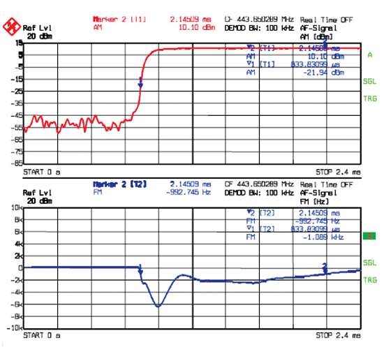 對(duì)于發(fā)射機(jī)和頻綜源來說,它們的幅度、頻率和相位瞬態(tài)特性是重要的測(cè)試指標(biāo)。一般來說,頻率穩(wěn)定時(shí)間是指發(fā)射機(jī)在輸出電平達(dá)到一定數(shù)值(通常為穩(wěn)定輸出功率-30dB)開始,監(jiān)測(cè)FM解調(diào)頻譜,直到頻率穩(wěn)定到設(shè)計(jì)限值之內(nèi)的這一段時(shí)間。