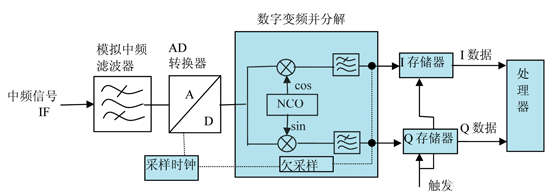輸入頻譜儀的射頻信號(hào)經(jīng)過混頻后變?yōu)橹蓄l信號(hào)IF,再經(jīng)過帶通濾波器(中頻濾波器)進(jìn)入A/D轉(zhuǎn)換器。在數(shù)字處理部分,對(duì)下變頻為基帶的IQ信號(hào)進(jìn)行低通濾波和欠采樣,存儲(chǔ)在內(nèi)存中,準(zhǔn)備進(jìn)一步處理,存儲(chǔ)的數(shù)據(jù)表述IQ信號(hào)的電壓值。